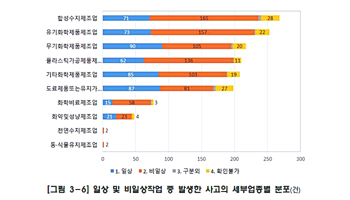 세부적으로 살펴본 결과 업종별로 일상 작업 사고와 비일상 작업 사고 비율에 차이가 있다. 화학비료 제조업에서는 비일상 사고가 58건으로 약 3.9배 더 많이 발생했으나, 도료제품 또는 유지 가공업에서는 일상 작업 87건, 비일상 작업 81건으로 비일상 작업이 약 0.93배 더 낮았다. 업종별로 살펴보면, 비일상 작업 사고가 모든 업종에서 더 발생하지는 않았다. 이를 보면 비일상 작업 사고 예방 가이드를 업종별로 자세히 나눌 필요성이 느껴진다.