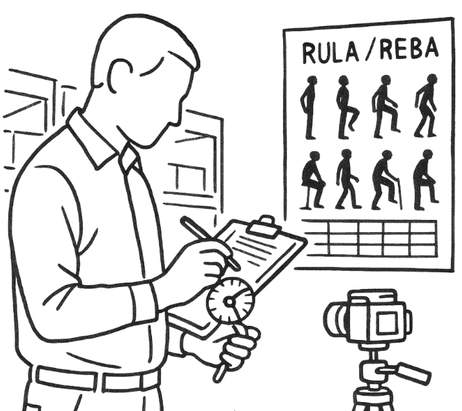 현장에 들어가면 먼저 OWAS, RULA, REBA와 같은 체크리스트형 평가 도구로 기본 위험도를 빠르게 훑는다. 동시에 1초 간격의 작업 샘플링(영상 캡처)을 실시해 대표 동작을 확보한다. 이 단계의 초점은 즉각적 위험 신호를 특정하는 데 있다. 구체적으로는 허리의 과도한 굴곡(스토핑), 반복적 중량물 취급, 상자 교대와 같은 절차성 동작, 그리고 고빈도 반복 동작을 우선 식별한다.