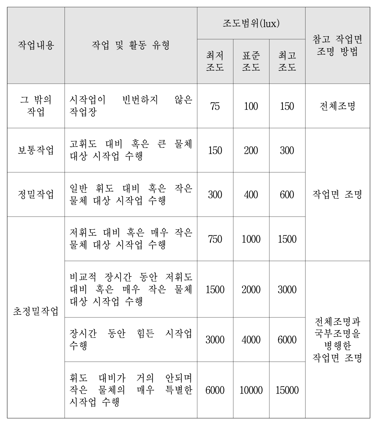 KS A 3011에 의한 조도 기준