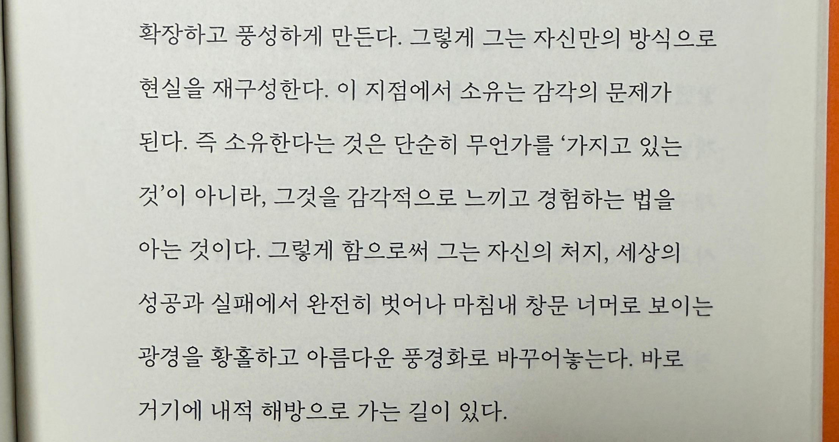 이 목수는 부지런한 노동자이자 한가로운 몽상가로서 두 가지 삶을 기꺼이 자신에게 허락한다. '하던 일을 잠시 멈추고 상상 속에서 그 넓은 풍경을 날아다니며 정원 근처에 사는 사람들보다 더 깊이 있게 풍경을 만끽한다.' 자신만의 방식으로 현실을 재구성한다. 이 지점에서 소유는 감각의 문제가 된다. 즉 소유한다는 것은 단순히 무언가를 '가지고 있는 것이 아니라, 그것을 감각적으로 느끼고 경험하는 법을 아는 것이다'