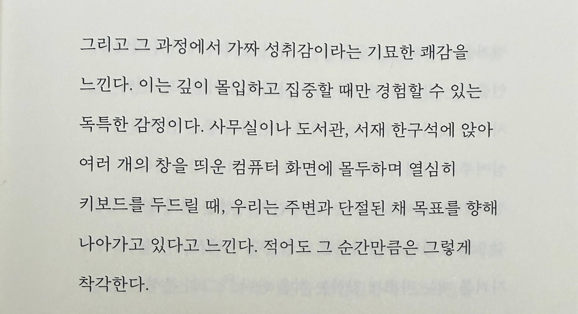 우리는 이따금 스스로를 위대한 피아니스트로 착각하는 듯하다. 빠른 속도로 키보드를 두드릴 때, 우리는 어떤 일에 완전히 몰두해 구체적인 목표와 예정된 성공을 향해 나아가고 있다고 믿는다. 그리고 그 과정에서 가짜 성취감이라는 기묘한 쾌감을 느낀다. 키보드를 두드릴 때, 우리는 주변과 단절된 채 목표를 향해 나아가고 있다고 느낀다. 적어도 그 순간만큼은 그렇게 착각한다.