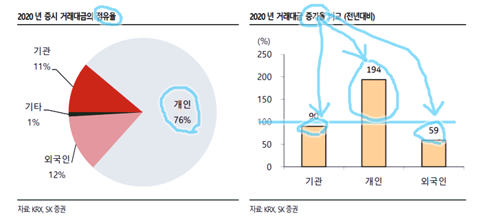 2. 증시 거래 대금 26.4조 원 중 20.1조 원이 개인에게서 나왔다.
