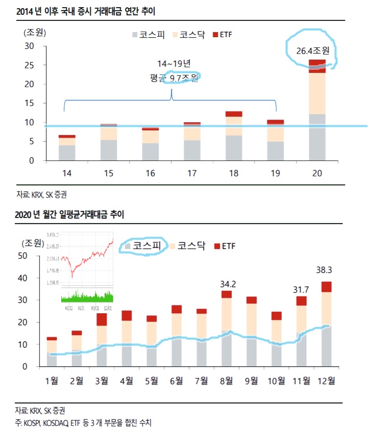 1. 20년 증시 거래 대금은 약 26.4조 원(243억 달러)이다. 14~19년도 평균 거래대금 9.7조 원 대비 2.7배 증가했다.