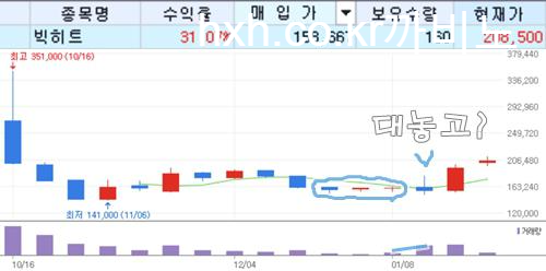 요즘 '시간은 흐르지 않는다', '과거-현재-미래는 동시에 발생한다' 같은 이야기에 빠져있다. 그래서 길~게 큰 호흡을 하며 닥터 스트레인지가 서클을 그리듯 손을 돌리며 시장을 떠올려 본 것 같다. 그때 본능적으로(?) 떠오른 게 위에 그려진 차트 모양이었고, 그런 형태를 지닌 차트를 찾다 보니, 그게 '빅히트'였다.