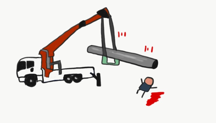 2021년 4월 28일 14:58경, 함양 소재 종합건설업 사업장의 출장지에서, 오거크레인으로 전주를 들어 올려 적재대에 싣던 중, 슬링 와이어로부터 이탈된 전주에, 재해자가  깔려 사망했다.
