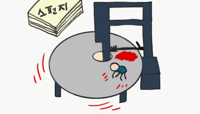 2021년 5월 17일 17:48경, 경기도 용인시 나무제품 제조 사업장에서, 재해자가 턴테이블로 올라가 재단된 제품을 정리하던 중, 작동 중인 수평 재단기 칼날과 제품 사이에 끼여 사망했다.