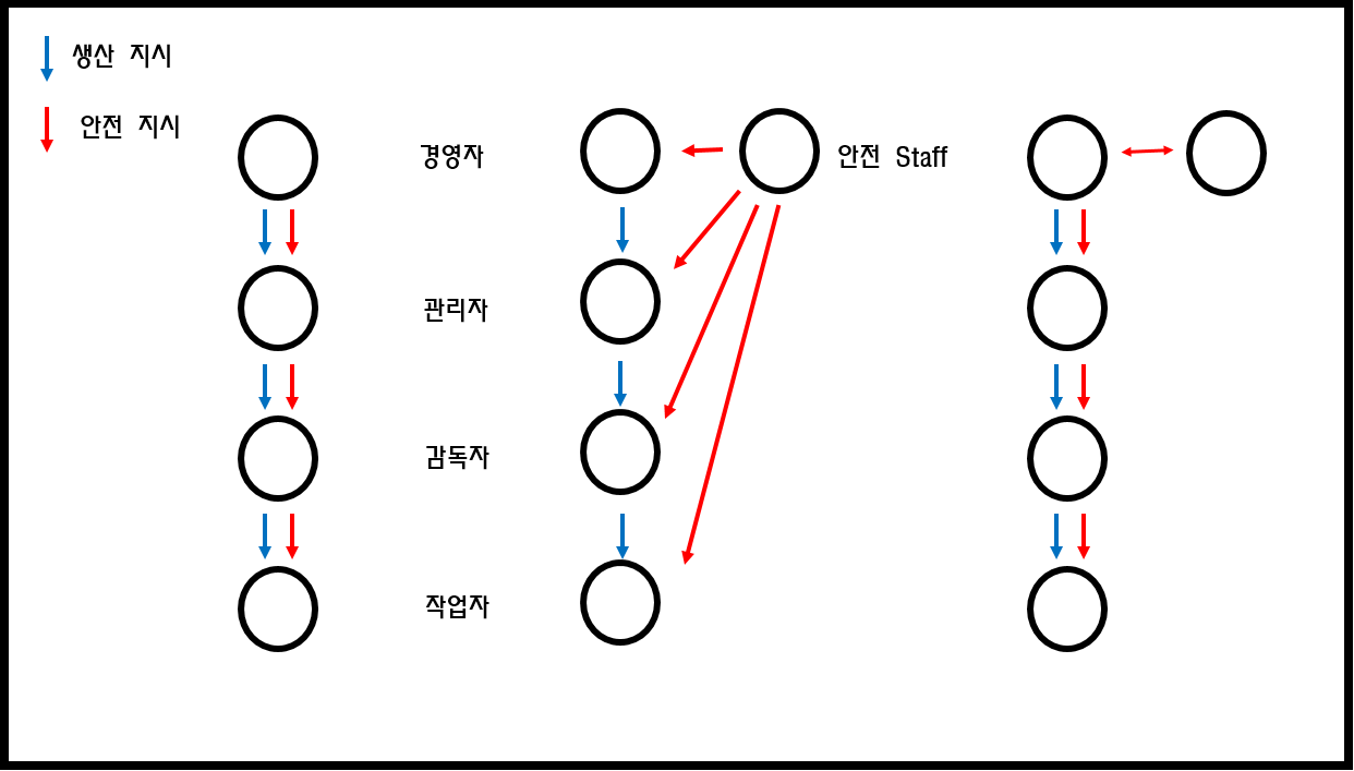 Line-Staff 혼합형 | 1. 지식 및 기술 축적이 쉽다 2. 안전에 관한 명령, 지시, 개선 조치가 신속/정확하다 |