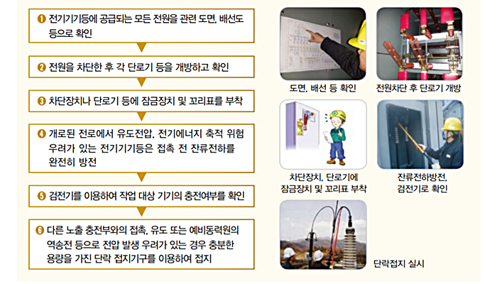 | 1. 작업기구, 단락 접지기구 등을 제거하고 전기기기등이 안전하게 통전될 수 있는지를 확인할 것 |