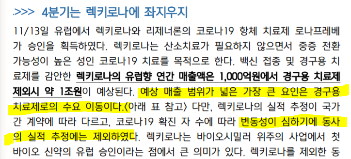 렉키로나의 실적 추정이 국가 간 계약에 따라 다르고, 코로나19 확진 자 수에 따라 변동성이 심하기에 동사의 실적 추정에는 제외하였다. ---. 렉키로나가 유럽 EMA 승인된 만큼, 유럽 일부 국가 및 동남 아 지역 등에서 비축 물량 계약이 체결 될 수 있을 것으로 보이며, 계약 규모에 따라 4분기 실적 추가 상향될 수 있다.