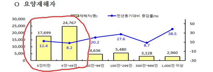 그 결과, 49인 이하 사업장에서 절반이 넘는 사망자와 요양 재해자가 발생했다. (2021. 6월 말 산업재해 발생현황)