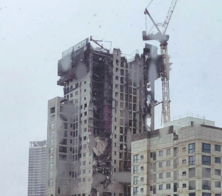 1. 38층 건물 상부 5개 층 외벽 붕괴