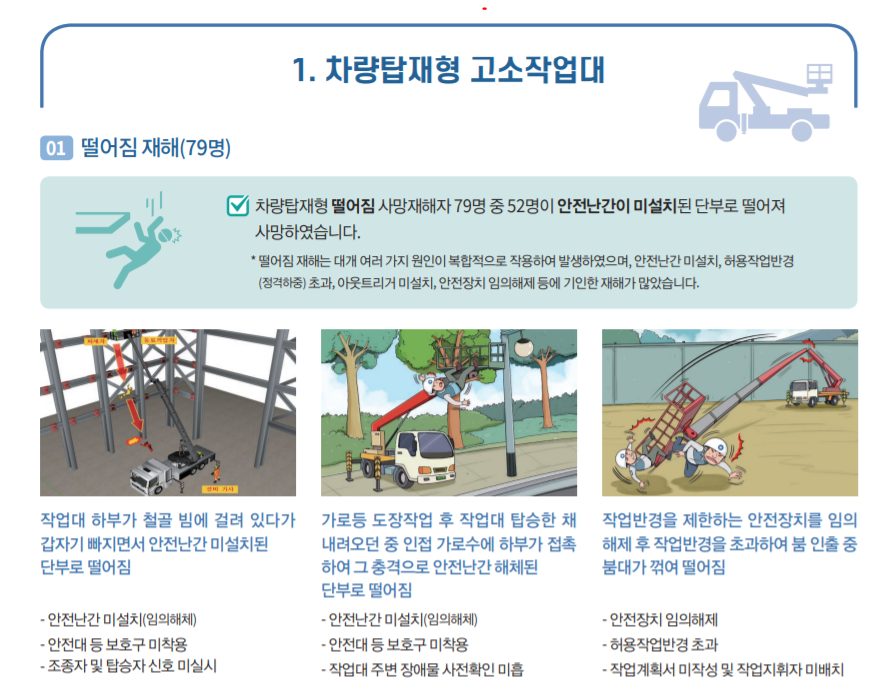 1) 차량탑재형 고소작업대의 경우 떨어짐 재해가 많았다.
