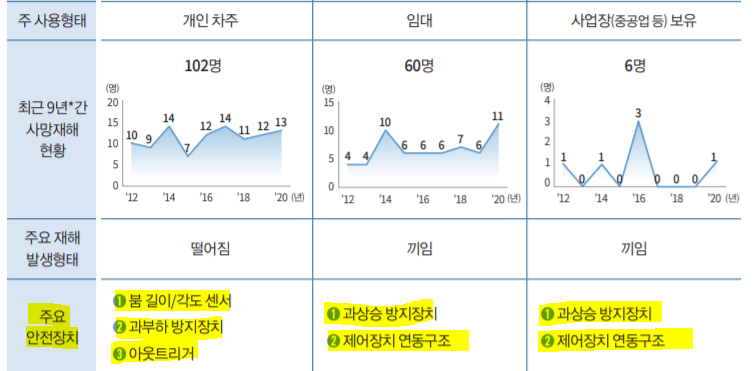 사고 요인으로는 안전난간 미설치 또는 임의해체, 안전대 등 보호구 미착용, 조종자 및 탑승자 신호 미실시, 작업대 주변 장애물 사전 확인 미흡, 안전장치 임의 해제, 허용 작업 반경 초과, 작업계획서 미작성 및 작업지휘자 미배치 등이 재해를 일으켰다.