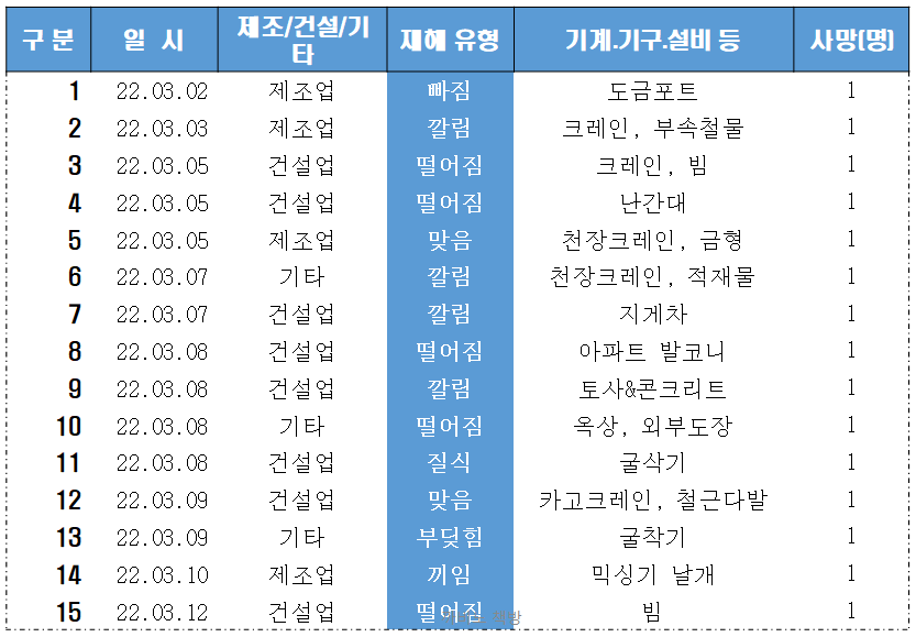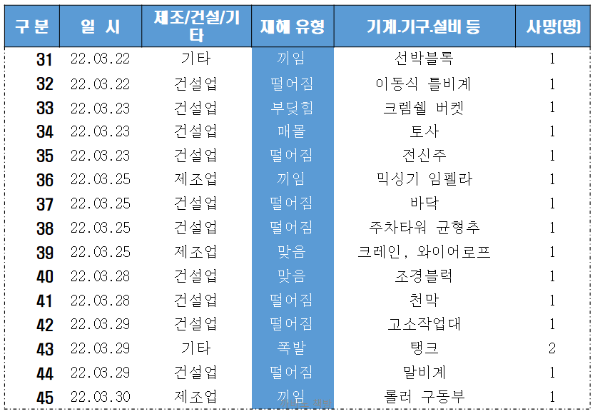 | 2022년 6월 사망사고통계, 떨어짐 사고 예방 점검 필요 (0) | 2022.07.03 |