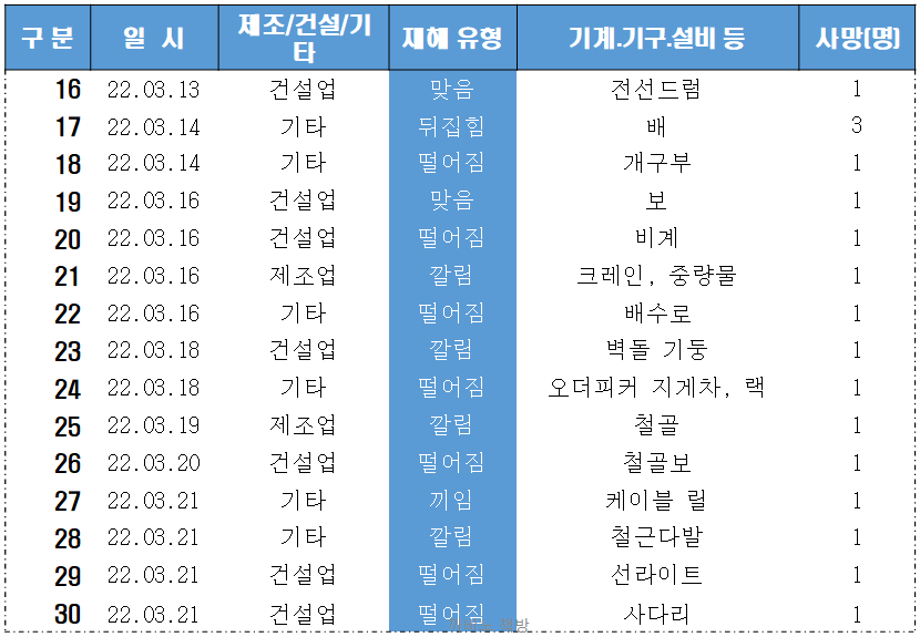 | 22년도 1월 '떨어짐', '끼임' 등 34건의 중대 사망재해 발생. (0) | 2022.01.31 |