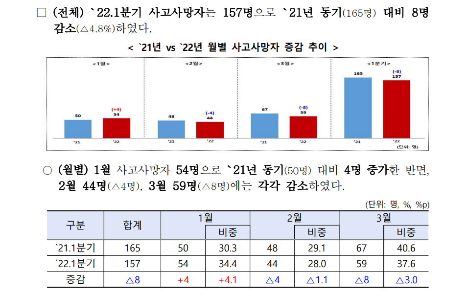 ○ ‘22. 1분기 사고 사망자157명, `21년 동기(165명) 대비 8명(△4.8%) 감소