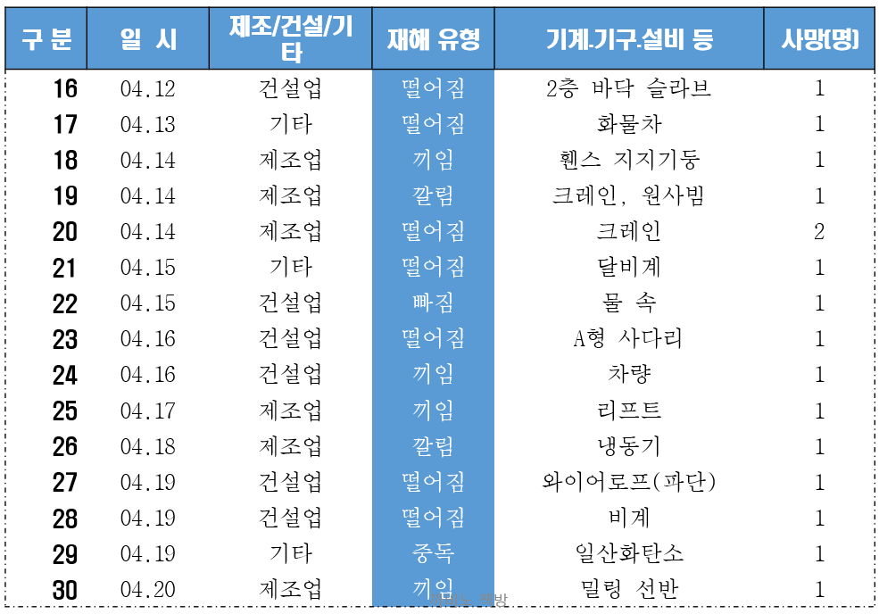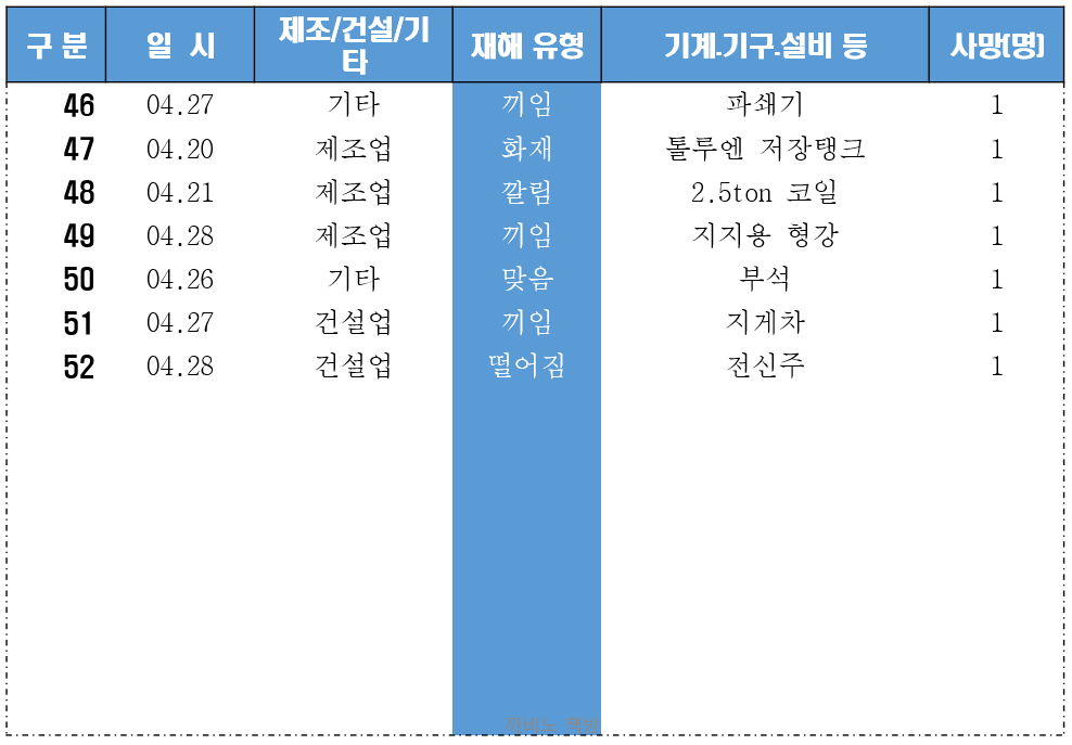 | 22년도 1월 '떨어짐', '끼임' 등 34건의 중대 사망재해 발생. (0) | 2022.01.31 |