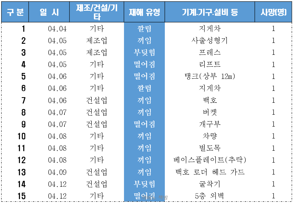 | 2022년 6월 사망사고통계, 떨어짐 사고 예방 점검 필요 (0) | 2022.07.03 |