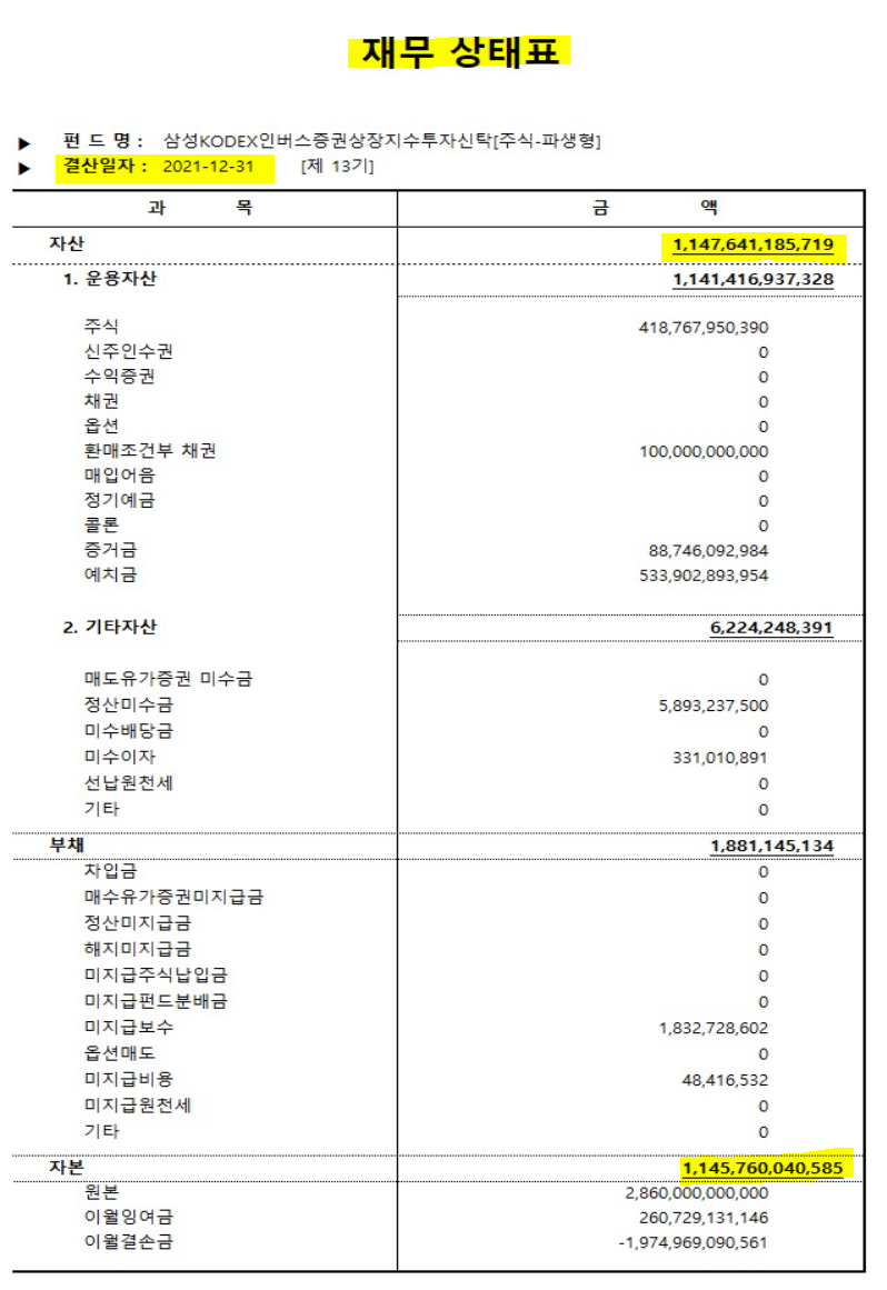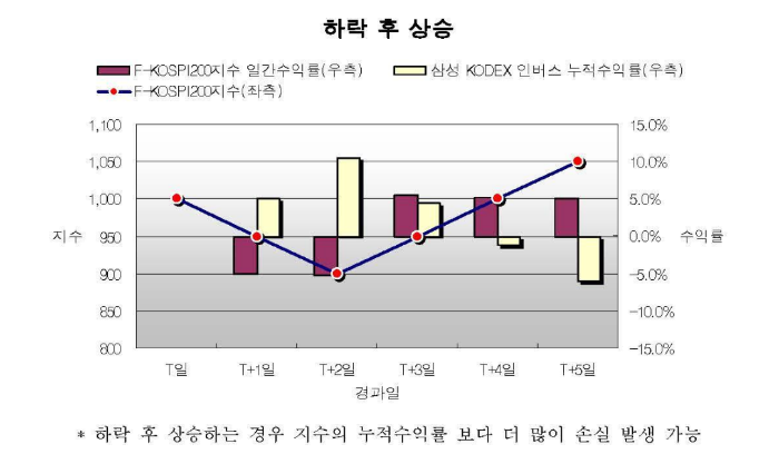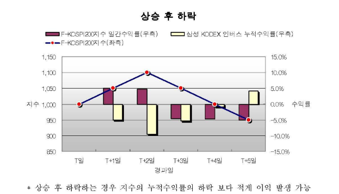 집합투자기구 명칭은 삼성KODEX인버스증권상장지수투자신탁[주식-파생형]으로 삼성자산운용주식회사에서 운용한다. 투자 위험 등급은 높은 위험으로 6단계 중 2단계로 실제 수익률 변동성을 감안하여 분류하였다. 투자자가 부담하는 수수료는 총보수에 0.640%이며, 1,000만 원 투자 시 1년 66000원, 2년 134000원, 3년 205000원, 5년 358000원, 10년 812000원이다.