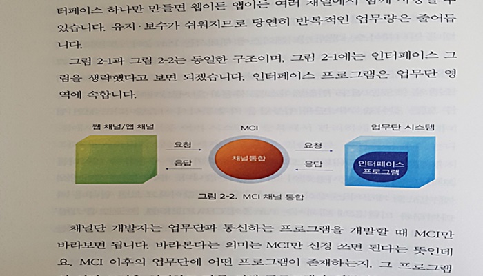 두 번째 파트부터는 독자를 좀 더 개발자스럽게 생각하며 이야기합니다. 고객이 보는 화면과 직원이 보는 화면이 다름을 주제로 이야기를 시작하죠. 우리가 만든 프로그램이 ATM기기, PC 웹, 스마트폰 앱 채널들을 서버와 정보를 주고받을 수 있게 하는 개념 같은 것도 설명하죠. 또 실제 현장에서 프로그램이 개발되어가는 과정을 그리기도 합니다.