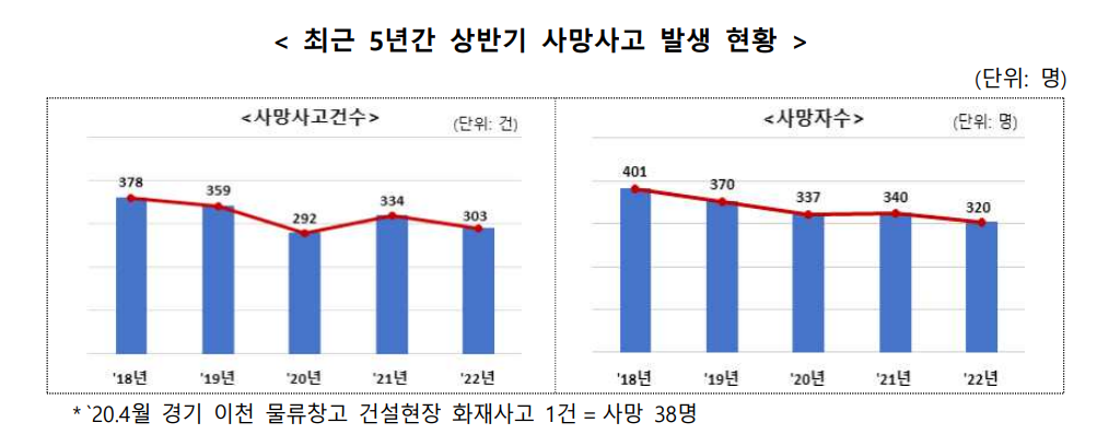 ‘22년 상반기 사망사고 303건(320명)으로 전년 동기 334건(340명) 대비 31건(△9.3%), 20명(△5.9%) 감소