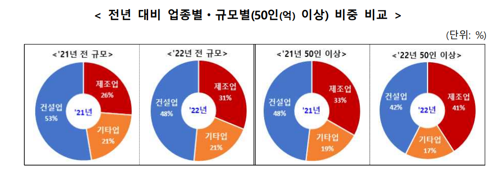 건설업 147건(155명), 전년 동기 179건(179명) 대비 32건(24명) 감소, 제조업은 92건(99명)으로 전년 동기 85건(89명) 대비 7건(10명) 증가,