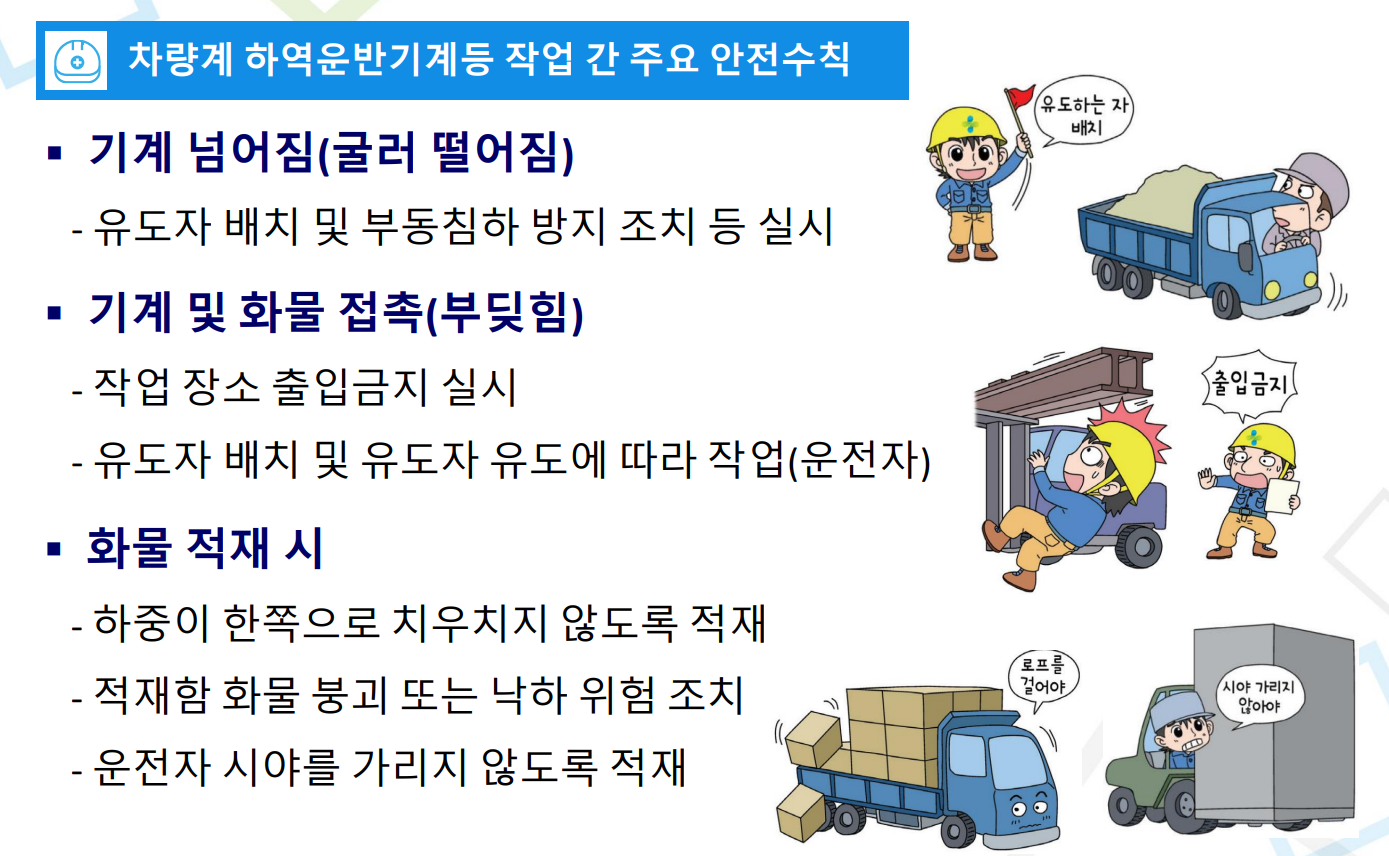- 작업계획서 작성 및 작업지휘자 배치 - 100kg이상 단위화물 상하차 시 작업 시 작업 방법을 준수해 작업 지휘 실시 - 화물 짐걸이(로프 등) 실시 등 고정 철저 - 운행 시 적재함 문 체결 |