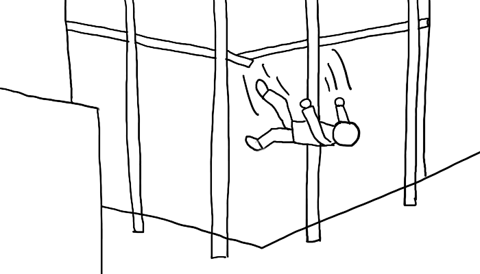 약 6.8m 높이 벽에서 아래로 떨어져 사망했다.