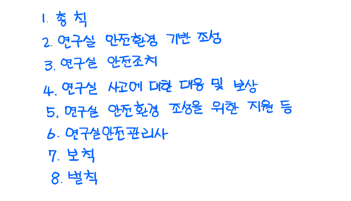 | 고시 | 연구실 사고에 대한 보상기준 연구실 안전점검 및 정밀안전진단에 관한 지침 안전관리 우수연구실 인증제 운영에 관한 규정 안전점검 및 정밀안전진단 실시결과와 실태조사 등의 검토기준 및 절차 등에 관한 고시 연구실 안전 및 유지관리비의 사용내역서 작성에 관한 세부기준 연구실 사전유해인자위험분석 실시에 관한 지침 연구실 설치운영에 관한 기준 |