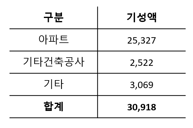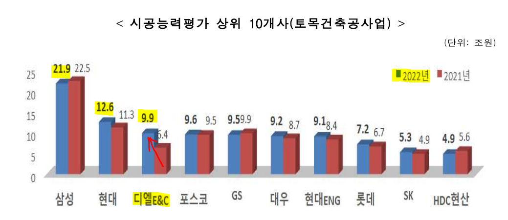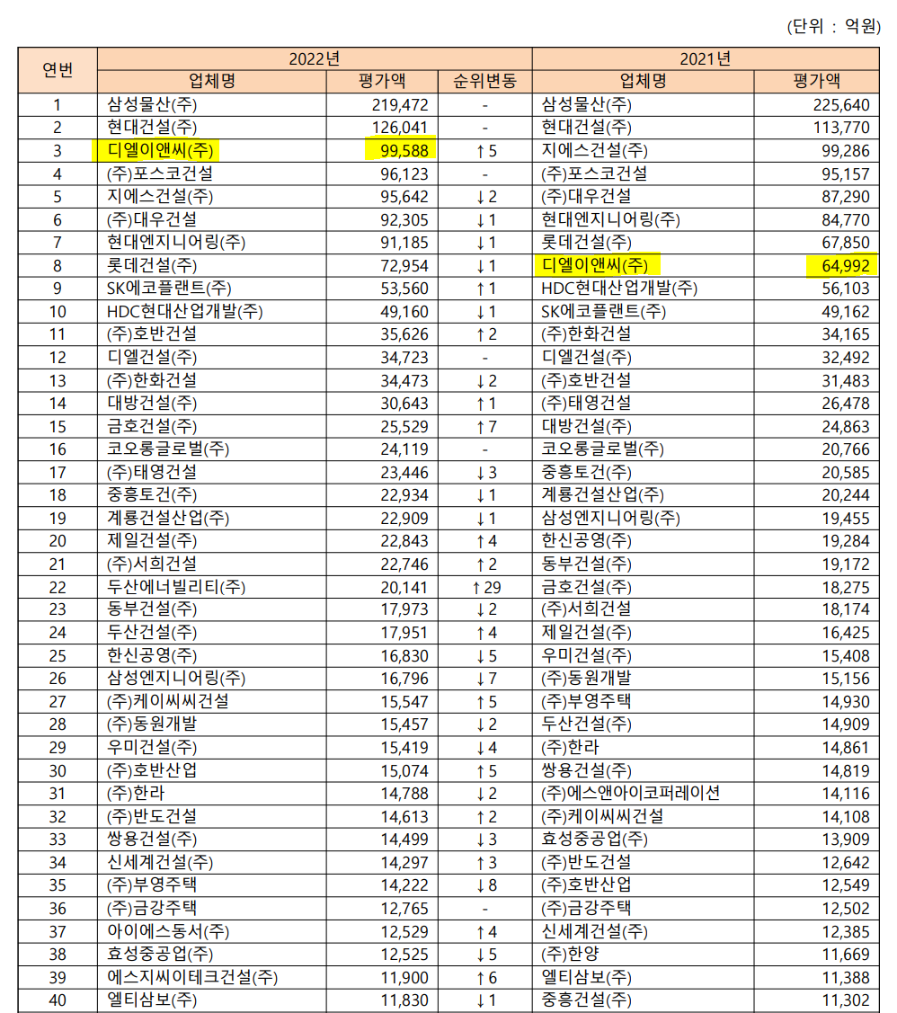 대림산업㈜에서 건설사업부문을 분할하여 설립된 디엘이앤씨㈜(9.9조원)가 전년 8위에서 3위로 상승했다.