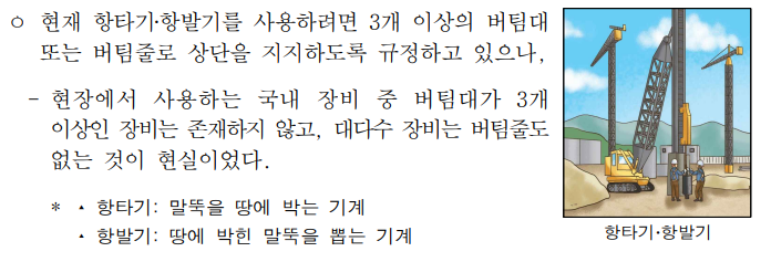 현재 항타기.항발기를 사용하려면 3개 이상의 버팀대 또는 버팀줄로 상단을 지지하도록 규정하고 있으나, 현장에서 사용하는 국내 장비 중 버팀대가 3개 이상인 장비는 존재하지 않고, 대다수 장비는 버팀줄도 없는 것이 현실이었다.