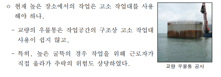 현재 높은 장소에서의 작업은 고소 작업대를 사용해야 하나, 교량의 우물통은 작업공간의 구조상 고소 작업대 사용이 쉽지 않고, 특히, 높은 굴뚝의 경우 작업을 위해 근로자가 직접 올라가 추락의 위험도 상당하였다.