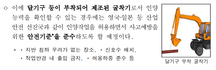 이에 달기구 등이 부착되어 제조된 굴착기로서 인양 능력을 확인할 수 있는 경우에는 영국?일본 등 산업안전 선진국과 같이 인양작업을 허용하면서 사고예방을 위한 안전기준을 준수하도록 할 예정이다.