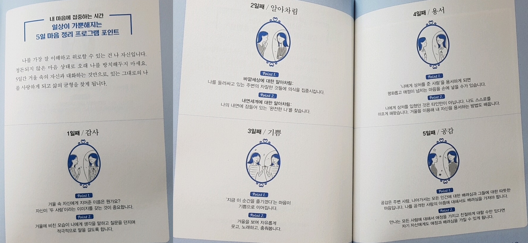 마인드풀니스 호흡법은 의자에서 기본자세를 취하고, 감각을 의식한 뒤, 잡념이 떠오를 때 호흡에 주의를 집중하는 것입니다. '거울을 보며 대화하기와 눈을 감고 잡념을 없애는 것', 서로 다른 방법이지만 추구하는 바는 비슷합니다. 책 전체 페이지에 쓰인 거울 카운슬링보다는 일부분에 쓰인 마인드풀니스 개념에 눈이 더 가네요.