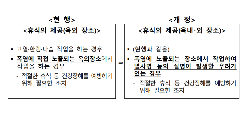 ㅇ 이번 개정으로 실외작업장뿐만 아니라 실내작업장 근로자에게도 휴식 제공이 의무화됨으로써 열사병 등 온열질환 예방을 위한 근로자 보호제도가 보다 두터워졌다.
