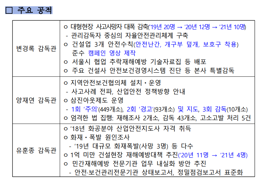 이러한 정책이 현장에서 원활히 추진될 수 있도록, 산업안전보건 감독관의 역량 강화를 위한 노력도 지속할 계획이다.