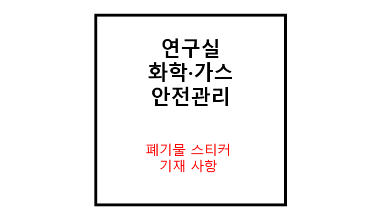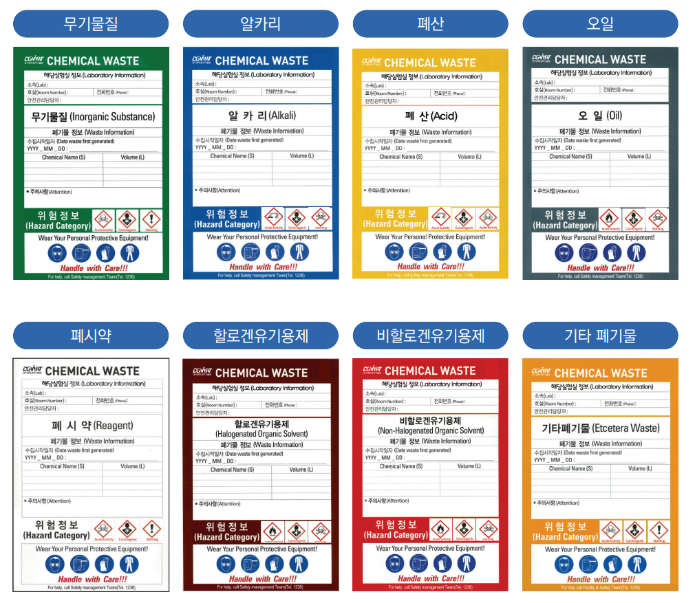 | 3. 폐기물 정보 | ▸용량: kg 이나 L 로 표시 ▸상태: 가급적 단일 화학종 수집, 수용액 (pH paper를 이용하여 대략적인 pH 기록), 혼합물질 (모든 혼합물질의 화학물질명과 농도를 명확히 표기), 유기용매 (화학물질명을 명확히 표기) ▸화학물질명: 포함하고 있는 모든 화학종을 기록하고 대력적인 농도를 퍼센트(%)로 나타낸다. ▸잠재적인 위험도: 폭발성, 독성 등 잠재적인 위험을 가진 경우 해당사항을 모두 기록하여 취급 시 주의하도록 한다. ▸폐기물 저장소 이동 날 |