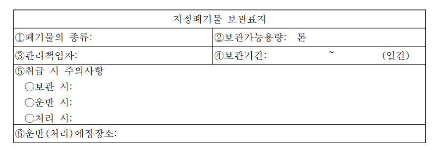 지정폐기물의 보관창고에는 보관 중인 지정폐기물의 종류, 보관가능 용량, 취급 시 주의사항 및 관리책임자 등을 적어 넣은 표지판을 설치하여야 한다.