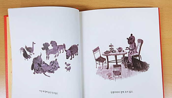 그림과 짧은 글로 이뤄진 구성이다. 줄거리를 담기가 어렵다. 아주 짧게 한 문장으로 요약하면, 고양이인 척하는 호랑이와 호랑이인 척하는 고양이가 결국에는 누가 누구인지 아무도 모르게 된다는 내용이다. 책을 덮고 나니 씁쓸한 기분이 든다. 있는 그대로의 모습을 다른 누군가에서 평가받아야 하는 건 여기나 저기나 마찬가지라는 생각 때문일까?