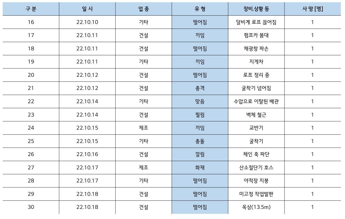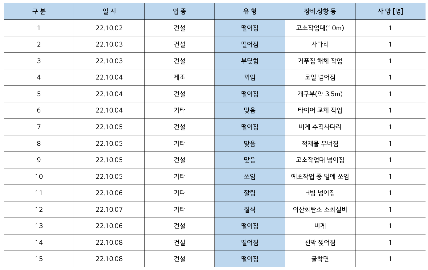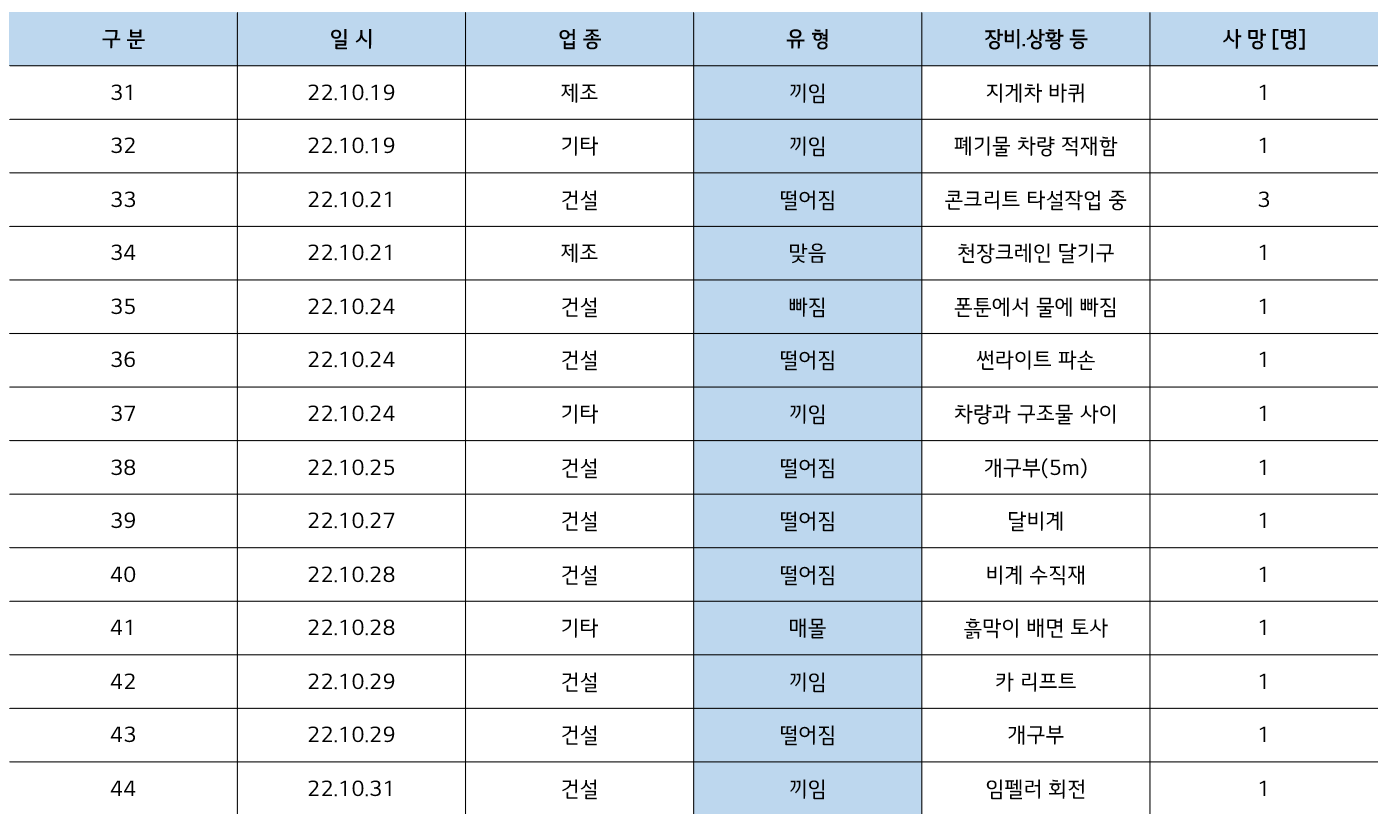| [23년 4월] 건설현장, 제조 사업장, 기타 작업 사망사고통계 (0) | 2023.05.06 |