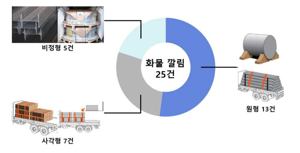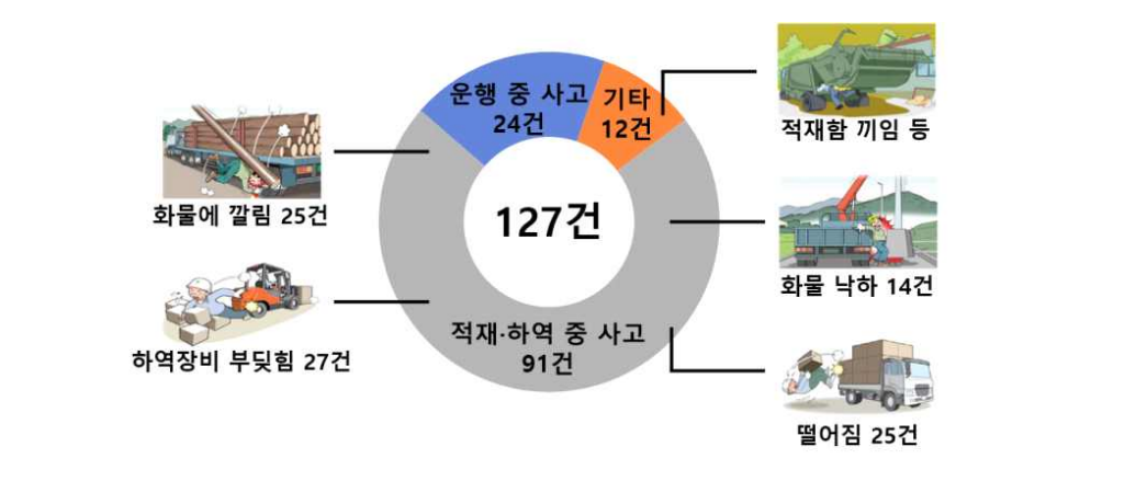 운행 중 교통사고는 24건(18.9%)인 반면, 사업장 내에서 적재·하역 중에 떨어지거나 화물에 깔리고 보행 중인 다른 근로자를 치는 사고가 대부분(91건, 71.7%)이다.