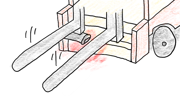 지게차 포크를 들어올린 후 아래 유압상태를 점검 중