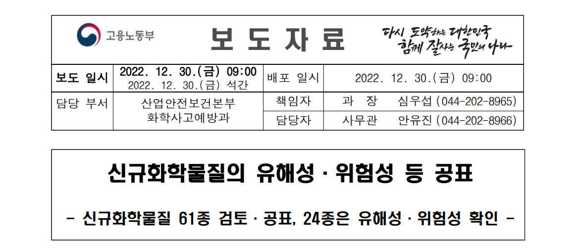 고용노동부(장관 이정식)는 올해 4분기 제조·수입된 신규화학물질 61종의명칭, 유해성·위험성 및 근로자의 건강장해 예방 조치사항 등을 공표했다.