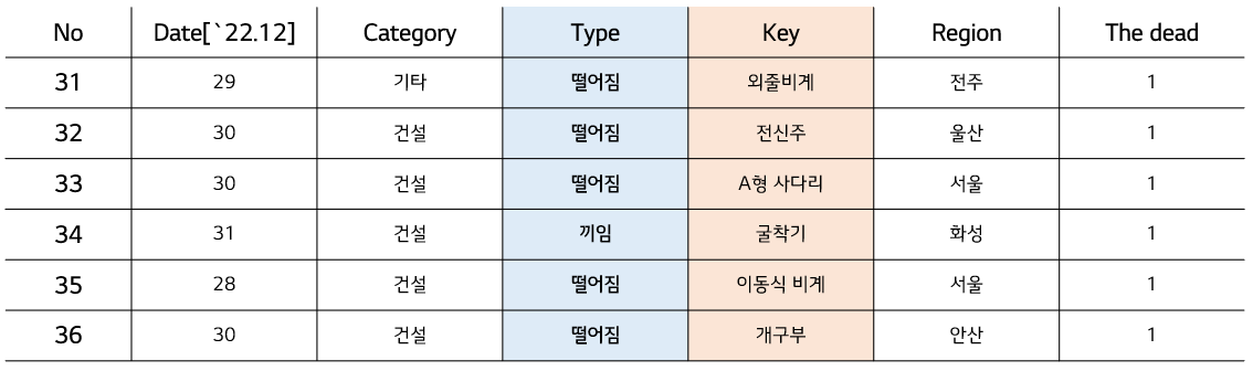 | [23년 4월] 건설현장, 제조 사업장, 기타 작업 사망사고통계 (0) | 2023.05.06 |