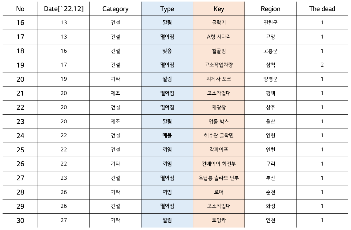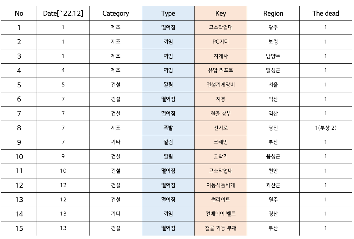사망사고 통계 정보를 취합하다 보면, 산업안전에 관한 정치. 경제. 사회적인 관심이 지속가능한가?라는 의문이 든다. 떨어짐, 끼임, 고소작업대, 굴착기, 썬라이트와 같은 키워드가 반복되는데서 드는 생각이다. 특히 올해는 중대재해처벌법이 시행된 시점이다. 현재까지 약 1년여간의 현황을 살펴보고, 앞으로의 2023년을 계획하는 전환점이 되어야 한다.